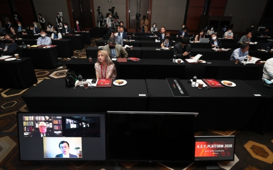 | 28일 오전 여의도 콘래드 서울에서 열린 머니투데이 주최 '2020 키플랫폼' 총회(팬더모니엄 그 이후 : 써로게이트 이코노미의 출현)에서 참석자들이 거리두기를 한 채 화상대담을 경청하고 있다. /사진=홍봉진 기자 |