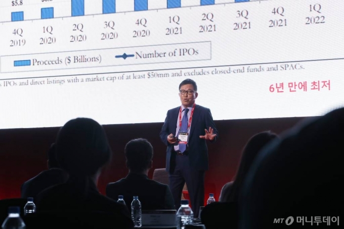 | 유효상 유니콘경영경제연구원 원장이 29일 여의도 콘래드 서울에서 머니투데이 주최로 열린 '2022 키플랫폼'에서 '유니콘 : 뉴노멀에서 노멀로'를 주제로 기조강연하고 있다. /사진=김휘선 기자 hwijpg@ |